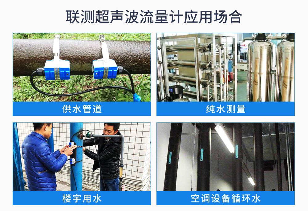 聯測超聲波流量計適合相對純凈液體流量的管外測量,尤其是在水流量測量、在工業循環水、空調制冷循環水、原水、高壓水、自來水,污水排放管等廣泛應用。