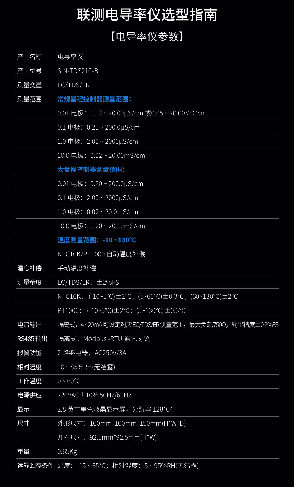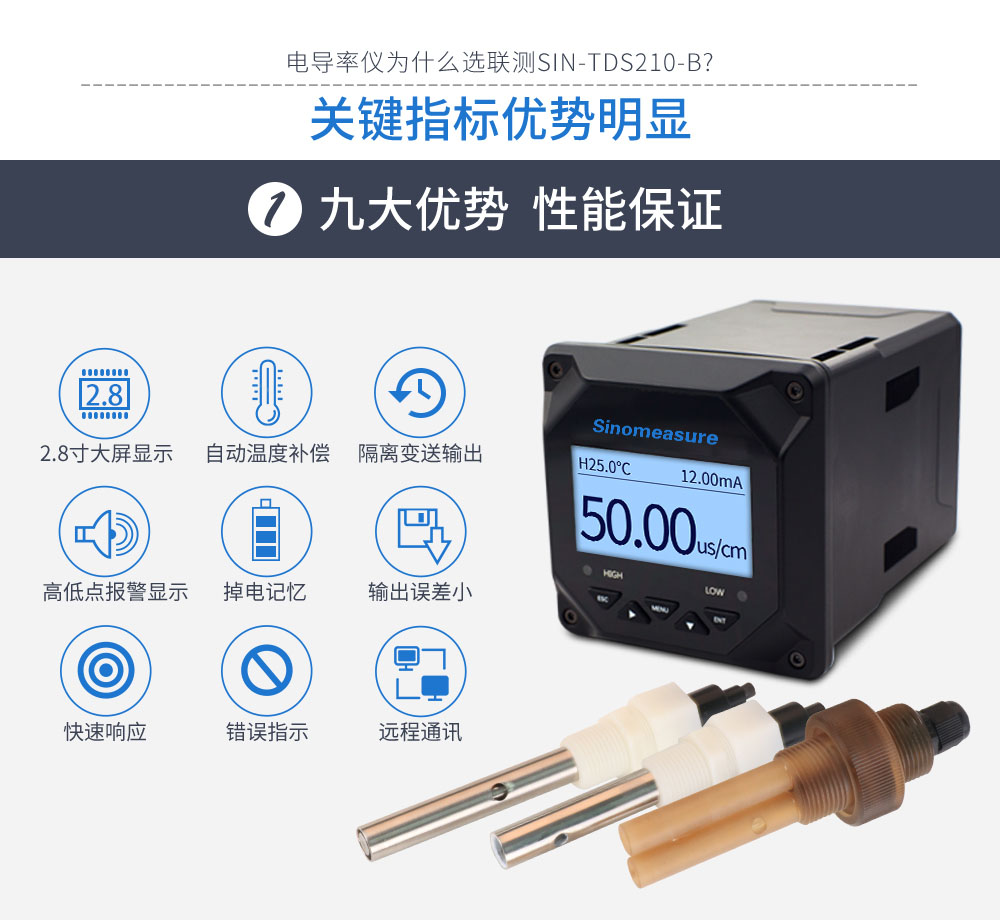 聯測SIN-TDS210工業電導率儀表,可對各種工業用水的電導率(TDS)值進行連續測量和控制,本裝置廣泛應用于科學實驗裝備、化工、制藥、環保、冶金、造紙、食品、飲料及供水等行業。根據水工業的環境和特點結合國際供電標準,考慮了特殊環境的電氣設計規范,增加了220VAC供電