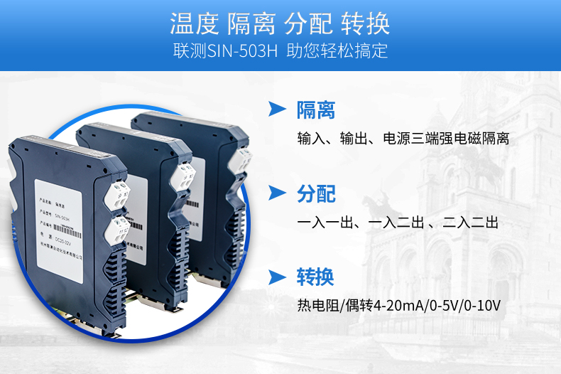 聯(lián)測(cè)溫度隔離器將PT100等熱電阻跟熱電偶信號(hào)轉(zhuǎn)換成各種電流、電壓等標(biāo)準(zhǔn)模擬量信號(hào),可以與PC機(jī)、PLC、DCS等實(shí)現(xiàn)工控監(jiān)測(cè)連接。抗干擾能力強(qiáng),遠(yuǎn)傳不受其他設(shè)備影響。輸入、輸出選擇范圍寬,準(zhǔn)確度高。電源可選擇,導(dǎo)軌安裝便于檢測(cè)與安裝。廣泛應(yīng)用于各種對(duì)溫度集中測(cè)量的監(jiān)控系統(tǒng)中。