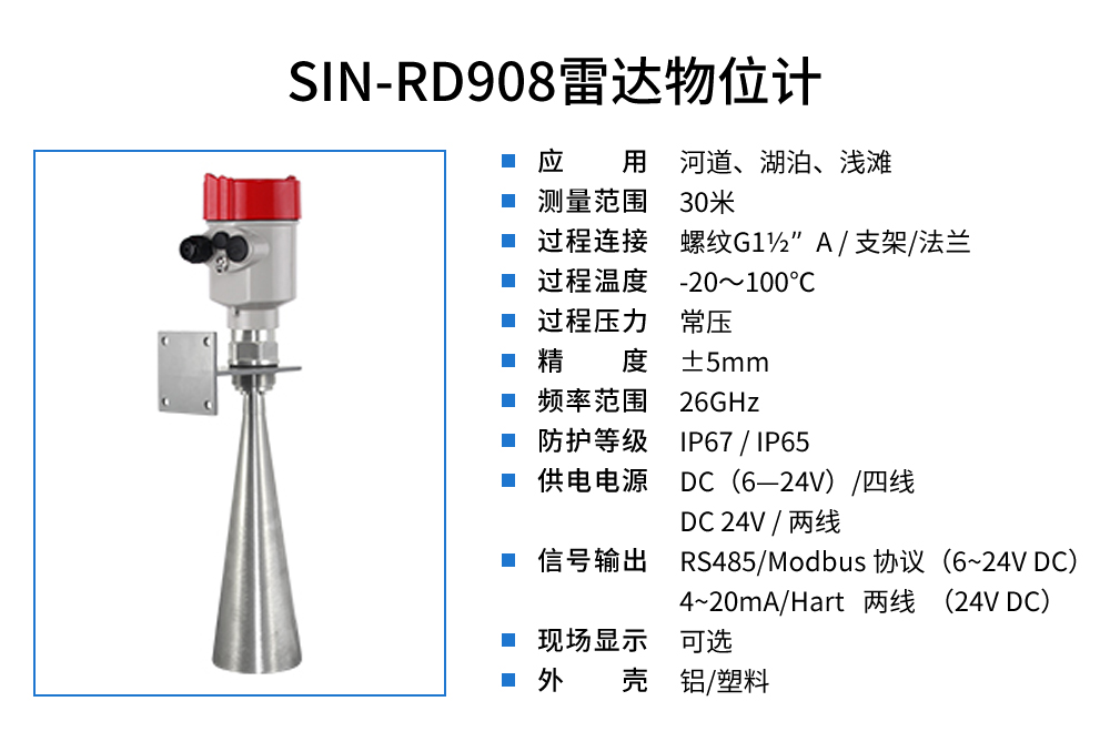 聯(lián)測(cè)SIN-RD908雷達(dá)液位計(jì)0-30米水位,雷達(dá)液位計(jì)天線發(fā)射及窄的微波脈沖,這個(gè)脈沖以光速在空間傳播,遇到被測(cè)介質(zhì)表面,其部分能量被反射回來(lái),被同一天線接收。發(fā)射脈沖與接收脈沖的時(shí)間間隔與天線到被測(cè)介質(zhì)表面的距離成正比,多用于水位、料位與化工場(chǎng)合。