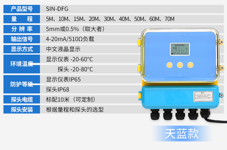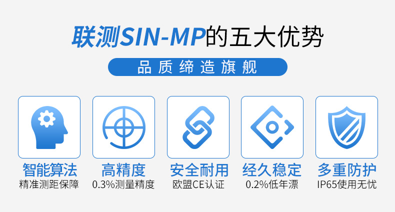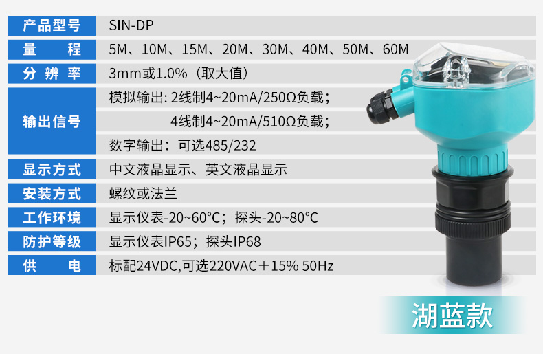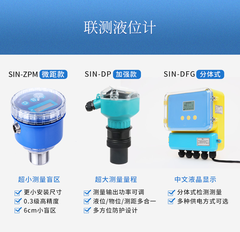 聯測SIN-MP超聲波液位計升級款。適用場合:污水處理 窨井 工廠水箱 罐體 市政工程 自來水 水利水電 鋼鐵 煤礦 電力 石油化工 城市內河湖泊、交通以及食品加工等高精度要求行業。
