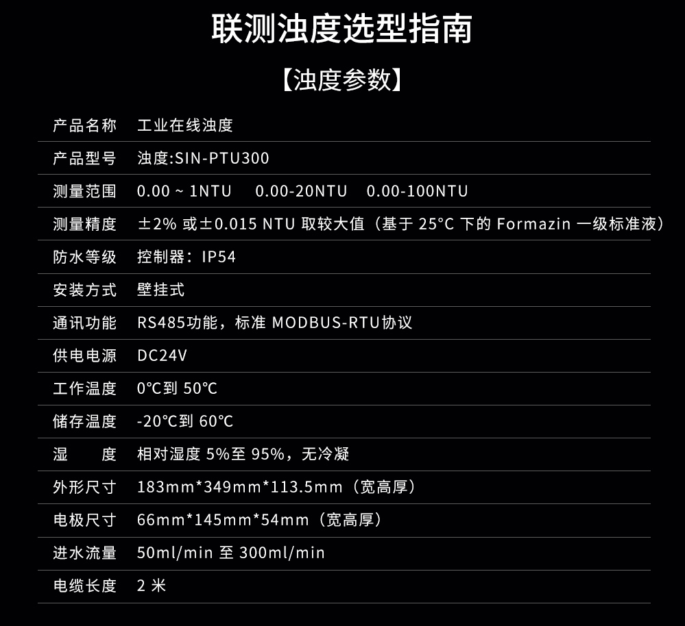 聯(lián)測(cè)_SIN-PTU300三個(gè)量程段規(guī)格,分別為0-1NTU量程段,0-20NTU量程段,0-100NTU量程段,其中0-1NTU量程段主要應(yīng)用出水濁度低、測(cè)量要求高的場(chǎng)合,其最低檢出限為0.015NTU,可穩(wěn)定監(jiān)測(cè)<0.1NTU水質(zhì),可配套小型凈水設(shè)備;0-20NTU量程段主要應(yīng)用于自來水出廠水/二次供水/管網(wǎng)末梢水/直飲水/膜過濾水/游泳池等場(chǎng)合;0-100NTU量程段主要應(yīng)用于地表水、原水、雨水回收水、污水處理廠出水和其他中水環(huán)境。